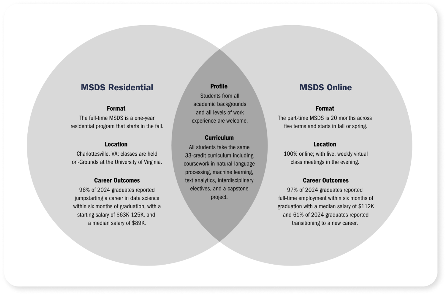At UVA School of Data Science, our MSDS program combines real-world relevance with academic excellence. Courses are designed for practical application and led by expert faculty with deep industry and research experience. Students gain hands-on skills, collaborate closely with peers, and explore cutting-edge concepts that drive innovation across sectors — from healthcare and finance to technology and policy.